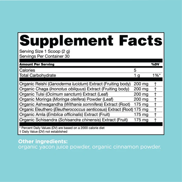 Die Mischung ist vollständig bio-zertifiziert, koffeinfrei, vegan und frei von zugesetztem Zucker, Aromen, Gluten, Soja, Milchprodukten, Eiern, Fisch und Schalentieren. Durch den neutralen Geschmack und die vielfältige Anwendung ist sie eine unkomplizierte Möglichkeit, eine Mischung aus Pflanzen- und Pilzzutaten in den Ernährungsalltag einzubinden.